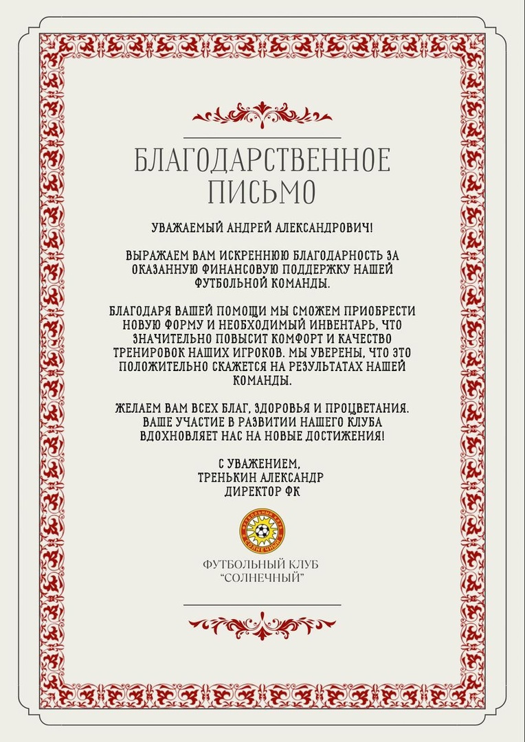 Недавно мы получили письмо от @ФК "Солнечный" – футбольного клуба, который воспитывает будущих чемпионов, но столкнулся с нехваткой оборудования и финансирования. Мы не могли остаться в стороне и готовы оказать поддержку!